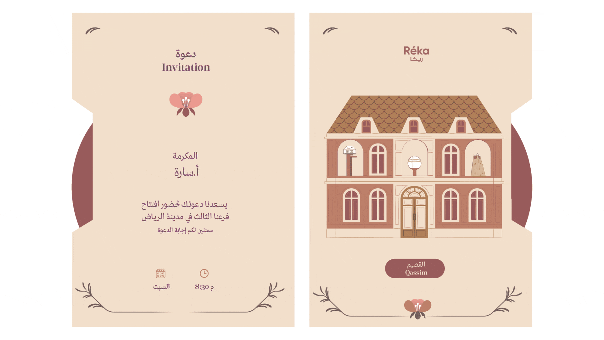Reka Bakery a brand specialized in providing luxury sweets and it is the first branch in Qassim. The store offers a variety of fresh pastries and sweets of high quality.The invitation for the opening of the First Riyadh branch has been designed in an interactive paper format.The invitation reflects the warm atmosphere of the bakery and invites visitors to enjoy a special experience of delicious pastries from Qassim to Riyadh.